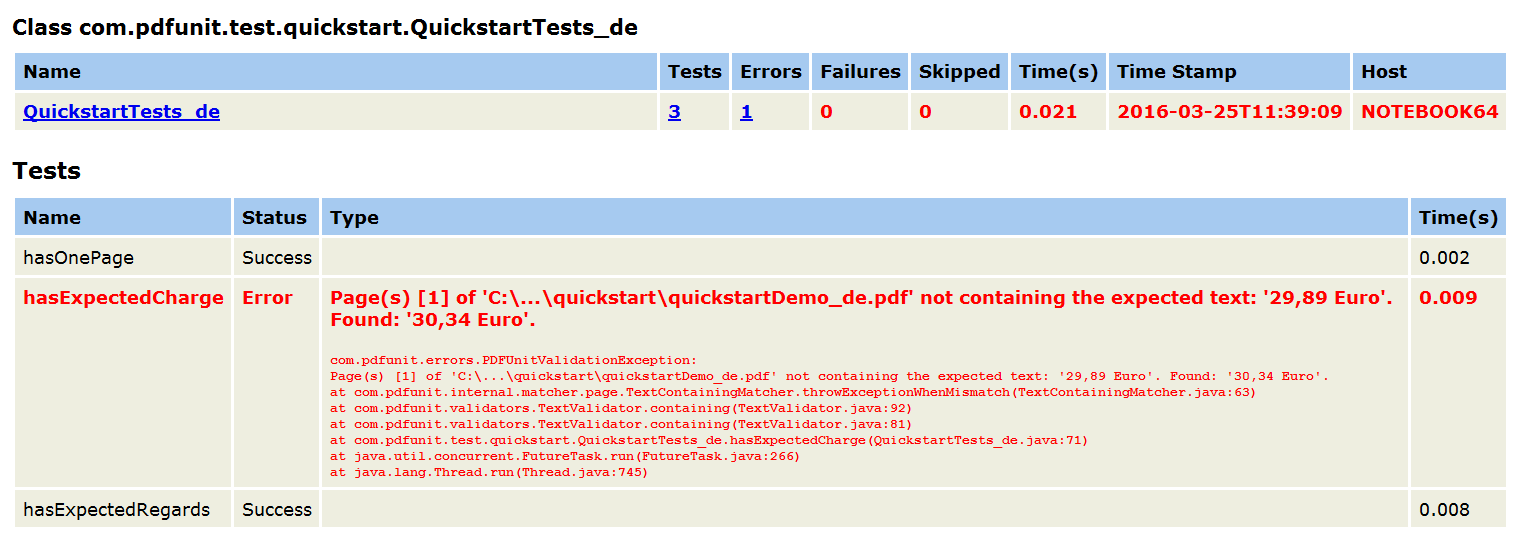 Der typische JUnit-Report zeigt entweder den Erfolg oder eine aussagekräftige Fehlermeldung: