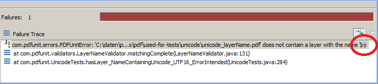 Das PDF-Dokument im nächsten Beispiel enthält einen Layer-Namen, der UTF-16BE-Zeichen enthält. Um die Wirkung der Unicode-Zeichen in der Fehlermeldung zu zeigen, wurde der erwartet Layername bewusst falsch gewählt: