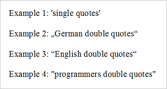 “English“ and „German“ style quotation marks do not disturb the execution of tests. But during the creation of a test you could have problems typing them with your editor. Hint: copy the required quotation marks from a word-processor or an exisiting PDF document and paste them into your file.
