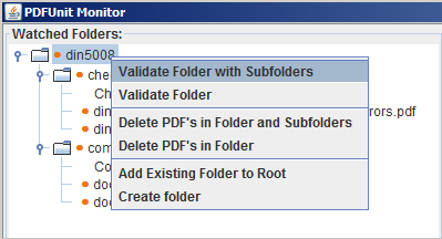 The PDFUnit-Monitor monitors all PDF documents in a defined directory and its subdirectories. It checks the documents against rules which are read from Excel files. The Excel files have to lay also in the monitored directories. If new PDF documents were copied into the monitored directories, the tests started automatically. A manual start is not necessary but can be done. If a PDF document complies with all rules, its name in the folder tree is decorated with a green checkmark. When a PDF test fails, all violations will be listed. Additionally its name is decorated with a red cross. This status is transferred to the directory name. The name of a folder is decorated with a green checkmark only, when the folder itself and all subdirectories contain valid PDF documents. Otherwise, the folder is decorated with a red cross.