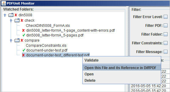 PDF document can be compared to a reference. The rules for the comparison are read from Excel files. When the PDFUnit-Monitor detects a difference between the test and the referenced PDF the name of the test document will be decorated with a red cross.