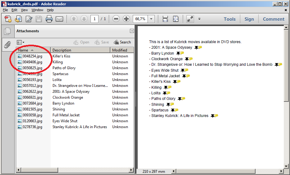 The next example refers to the file “kubrick_dvds.pdf”, an iText sample. Adobe Reader® shows the attachments: