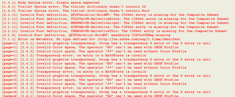 The error messages from the Preflight parser are passed through to PDFUnit. The images below show examples in Eclipse and in an HTML browser: