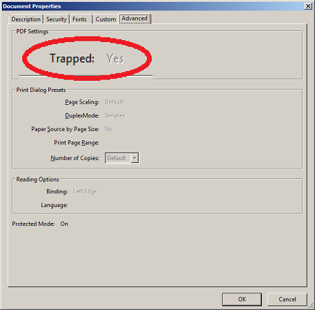 A PDF document contains the information about whether it is “trapped” or not. Adobe Reader® shows the property “Trapped” in the document properties dialog: